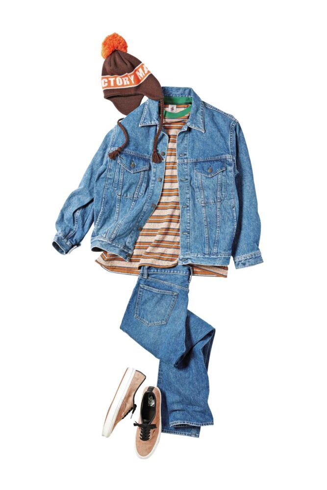 もちろん濃紺同士の組み合わせもかっこいいが、どうしても無骨な印象になりがち。そこで提案したいのが、上下ともにヴィンテージ加工が施されたデニムのセットアップ。ともに色落ちがしていれば、力の抜けた印象となり、クラシックなスケシューやボーダーTなんかのカリフォルニアテイストのウエアとも相性が抜群。小物類とインナーのカラーリングをブラウンベースに統一することで、よりこなれた印象を与えられるので、そこらへんも要チェック。参考にしてほしい!