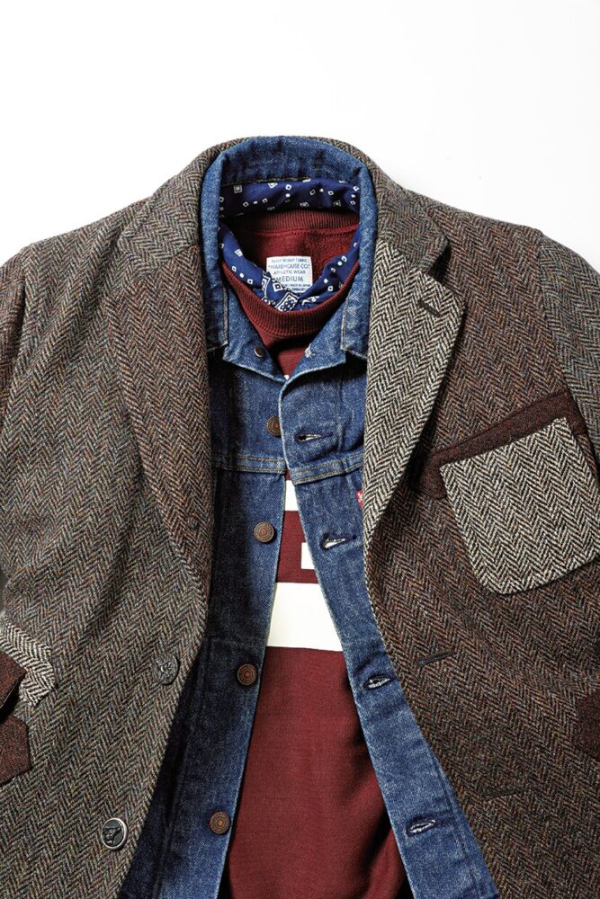 暖かみのある表情でカジュアルな印象を受けるツイードジャケット。中にGジャンを合わせるなら、色褪せたカジュアルなGジャンでテイストを合わせるのが重要。さらにインナーで上手にカジュアルアップさせるのがポイントだ。