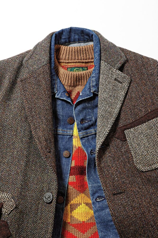 ツイードジャケット×色褪せGジャンのインナーアレンジでオススメなのは、ネイティブ柄のニット。ツイード素材とニットは同じ羊毛素材なので組み合わせの相性は良く、色褪せたGジャンとネイティブ柄のテイストも調和する。これぞアメカジライクなレイヤードテクと言えよう。