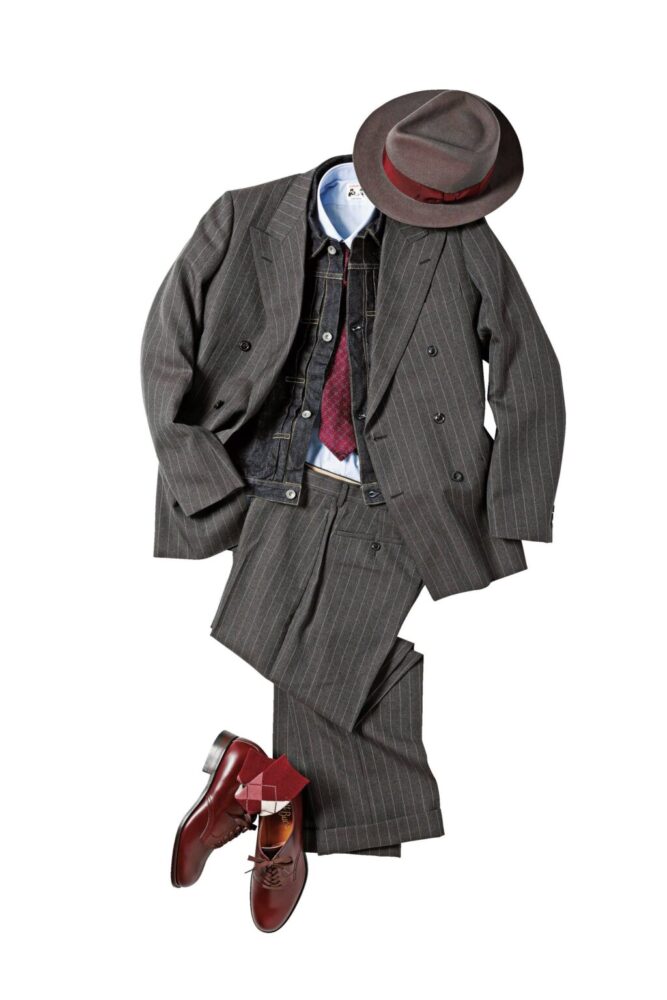 ダブルの前合わせやピークドラペル、サイドベンツなど、上品且つ貫禄のある印象を受けるダブルブレストジャケット。それにGジャンをインナーにスタイリングするのであれば、濃紺のGジャンで小奇麗にまとめるのが最適解だ。