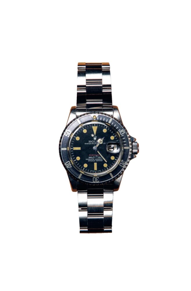1965~’80年まで製造されていたRef.1680。サブマリーナーシリーズでは初となるデイト機能付き。こちらは「SUBMARINER」のロゴが赤文字になっているレアな通称・赤サブモデルで、こちらの方が通常モデルよりも高値で取引される。330万円