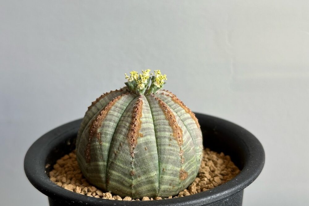 画像はユーフォルビア・オベサ。多肉系ユーフォルビアの中でも知名度の高い人気種で、このオベサばかりを収集する愛好家もいるほどです。小さな個体は球形をしていますが、大きくなると柱状に成長していきます。画像の個体は肌が少し木質化していますが、近年は木質化した個体ほど人気の高い傾向が見られます。参考価格:5060円