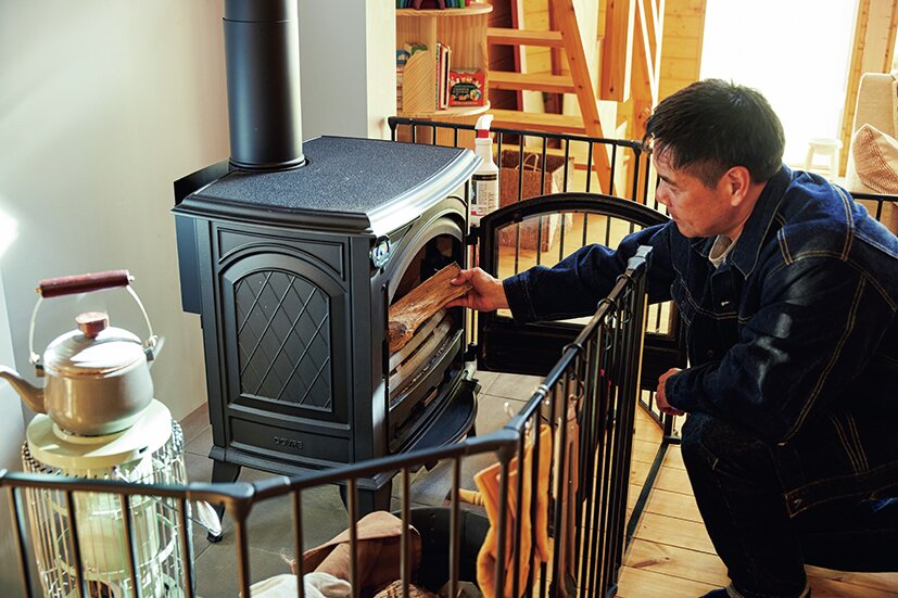 「BESSの家はメンテが大変という話も聞きますが、ワンダーデバイスの場合、それほど大変だと思ったことはないですね。ガルバリウムとウッドが組み合わさったデザインが気に入っています」と松﨑さん。リビングには薪ストーブが設置されており、火を入れれば家中が優しい暖かさに包まれ、奥様もお気に入りだという。