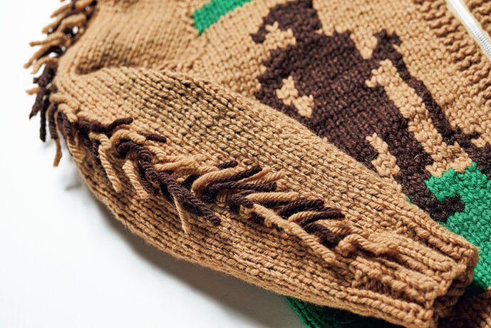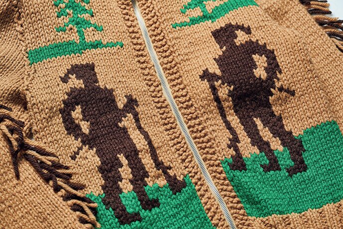 出店者、来場者、四方八方にセンスの塊みたいな人がいる空間。2023年の9月にも同じイベントがあったので、いつもの顔ぶれとパサデナに妙に落ち着くようになった。我々の目の前に出店していたお店で目についたこのカウチン。フリンジがついているというイレギュラー仕様に心奪われちゃた。フリンジで思い出したけど、中学生のとき、異様にフリンジがついたブーツが流行っていたな。ビバフリンジ!
