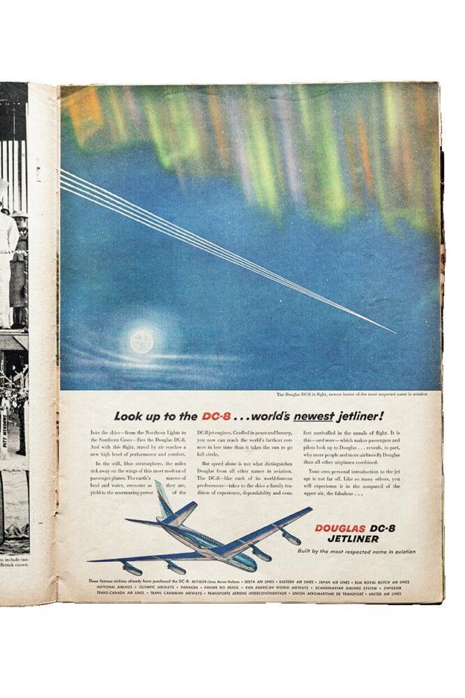 【1958年/LIFE】初期の主力ジェット旅客機ダグラスDC-8。“オーロラから南十字星まで“という見出しがエモい!