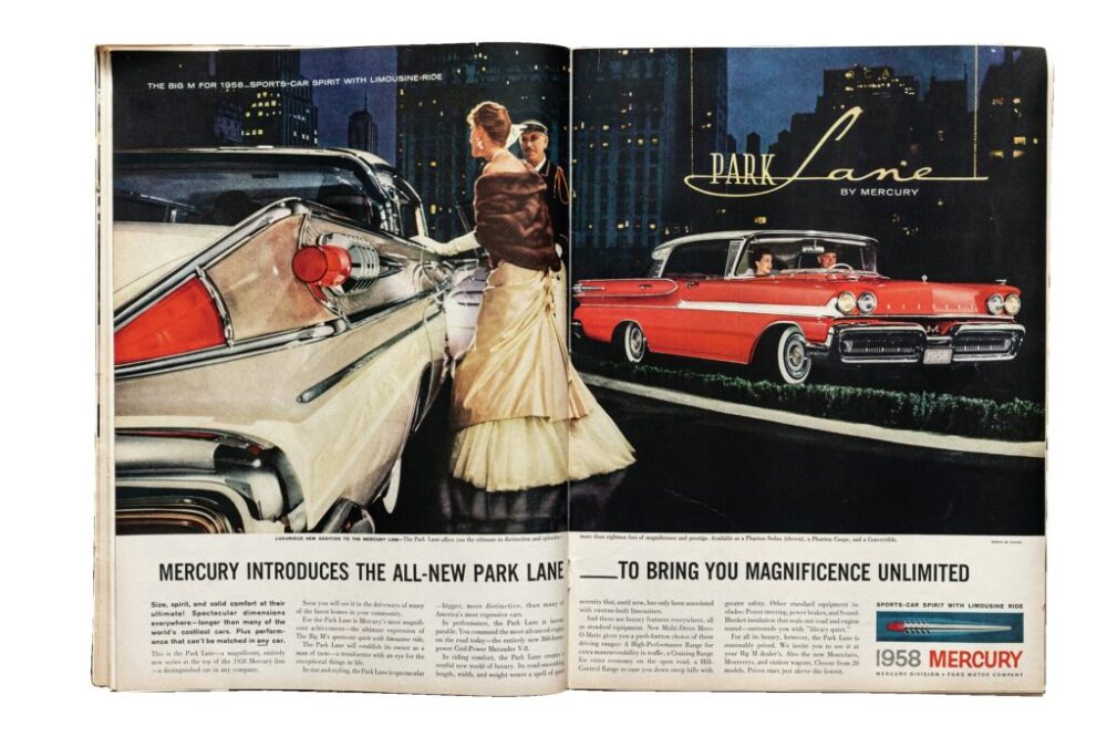 【1957年/LIFE】到底クルマとは思えないほど凝ったテールが目を引く、当時最新式の1958年型マーキュリーの広告。