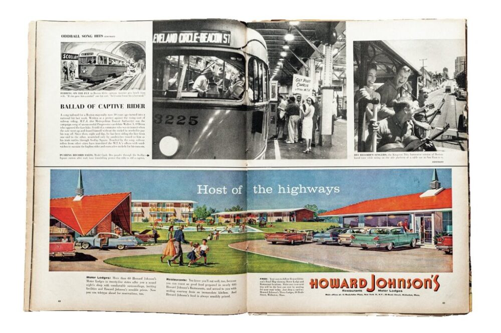 【1959年/LIFE】ハワード・ジョンソンというレストランとモーテル(モーターロッジ)の広告。レジャーやダイナーなどにクルマで出かけるのが人気だった当時の様子が窺える。