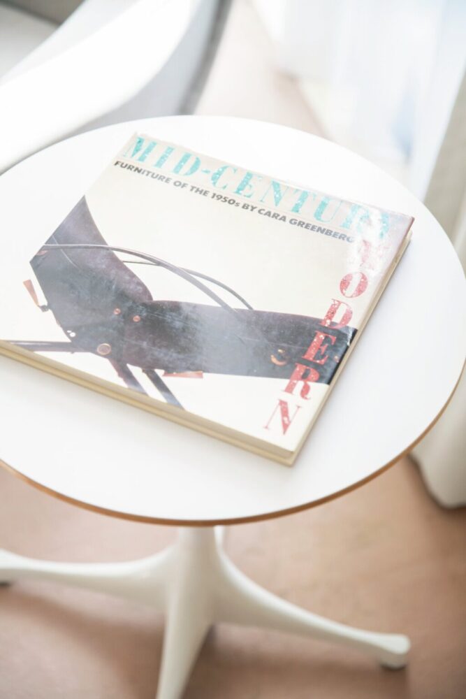 1954年にジョージ・ネルソンがデザインしたネルソンペデスタルテーブル。脚のグライズが初期型のデザインとなったヴィンテージ。テーブルに置かれた1988年発行のミッドセンチュリーモダンは、この時代の家具が再評価されるきっかけになった。