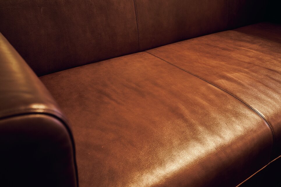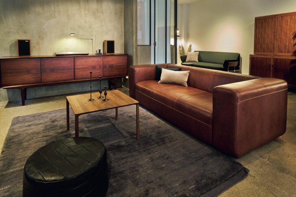 Box Sofa。オリジナル家具の定番ソファでブラウン、ダークブラウン、ブラックの3種類から革を選べる。両側のアームは取り外せる3分割仕様。どっしりした低めで奥行きがあるソファは憧れの家具。63万8000円