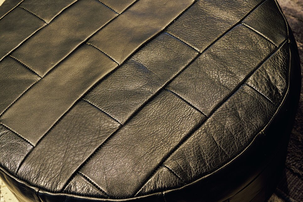 Lazy Cushion。パッチワーク仕様のレザークッション。内部にはウレタンフォームとその周りを綿が覆っているので型崩れしにくい。腰掛けたり、ソファに座って足を置いたり。くつろぎ方は自由だ。5万7200円