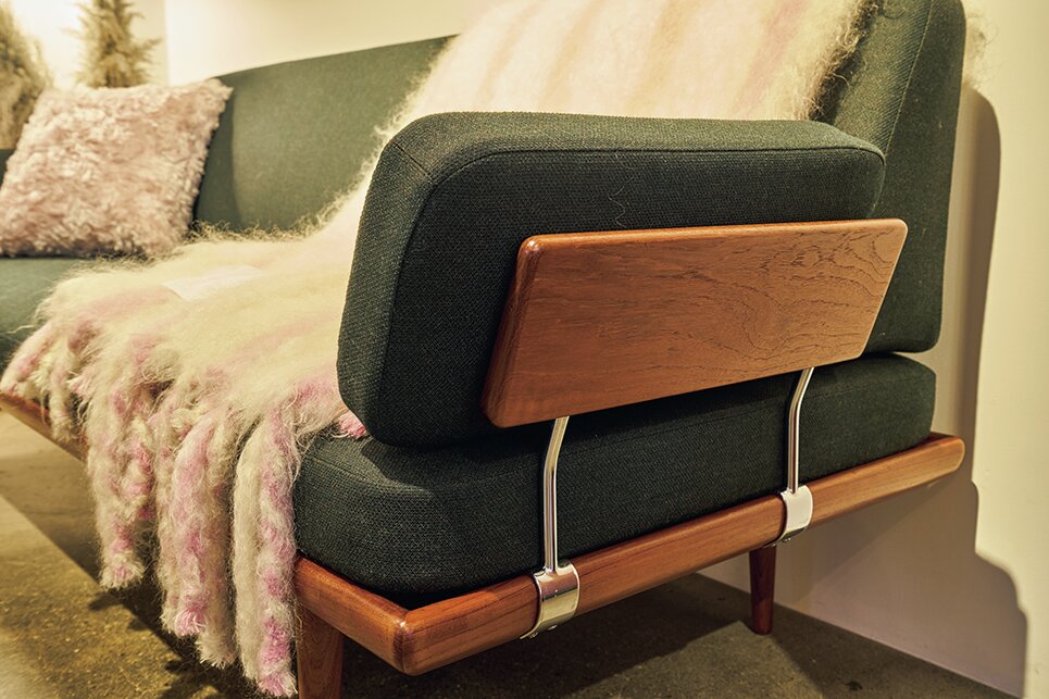 Daybed Sofa。デンマークのデザイナー、ピーターヴィッツの1960年代のソファ。少し角度を付けたアームレストを木と金属パーツで支えている。デザインと機能を兼ね備えた北欧家具らしい。