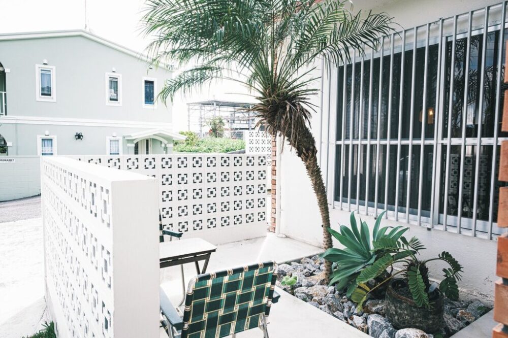 玄関の隣に新たに造ったデッキスペース。椰子の木は元々あったもので、きれいに整備をした。折りたたみ式のチェアを用意しているので、夜などお酒を楽しんだりすることも可能だ。