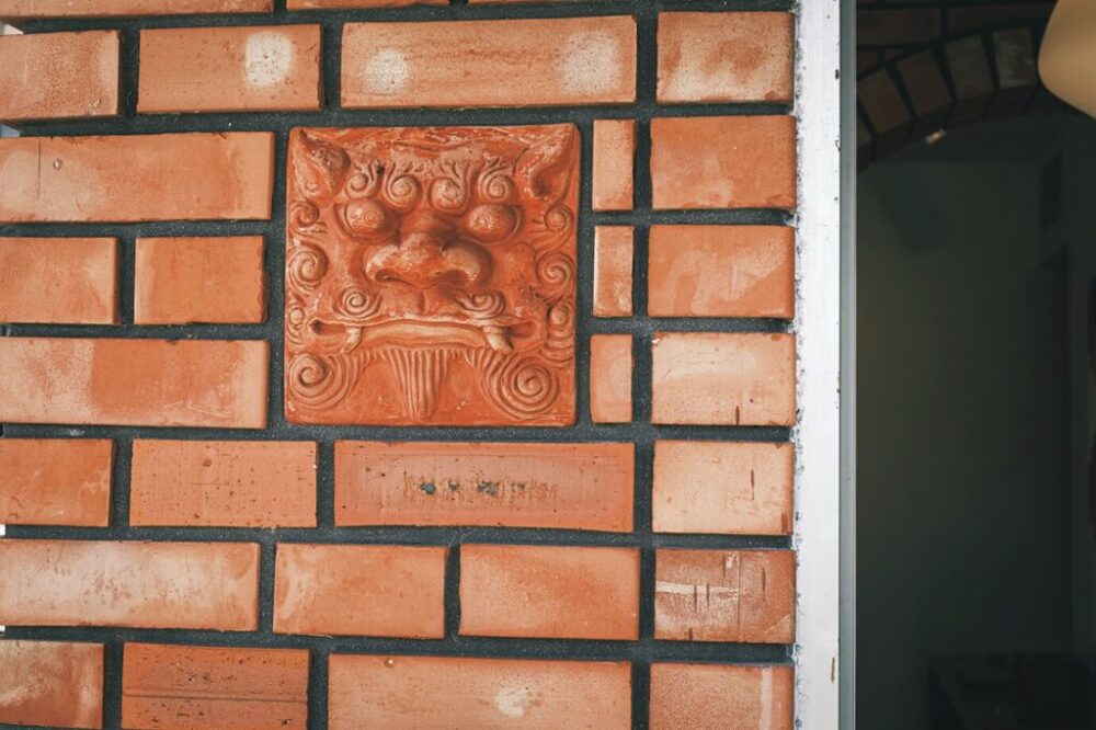 玄関はレンガをアーチ状にしたおしゃれなデザイン。シーサーが左右に埋め込まれており、沖縄ならではの魔除けもミックス。この玄関デザインもそのまま活かしているそうだ。