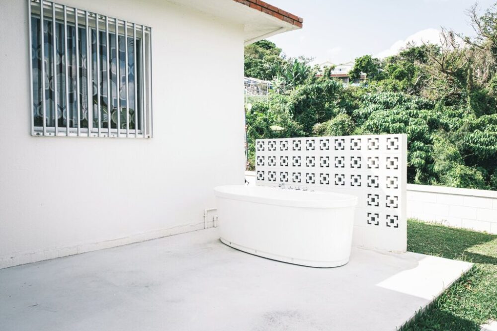 こちらも新しく造ったスペース。風呂場にあったバスタブを設置しているので露天風呂を楽しむことができる。目の前は緑に覆われているので安心して入浴が可能だ。
