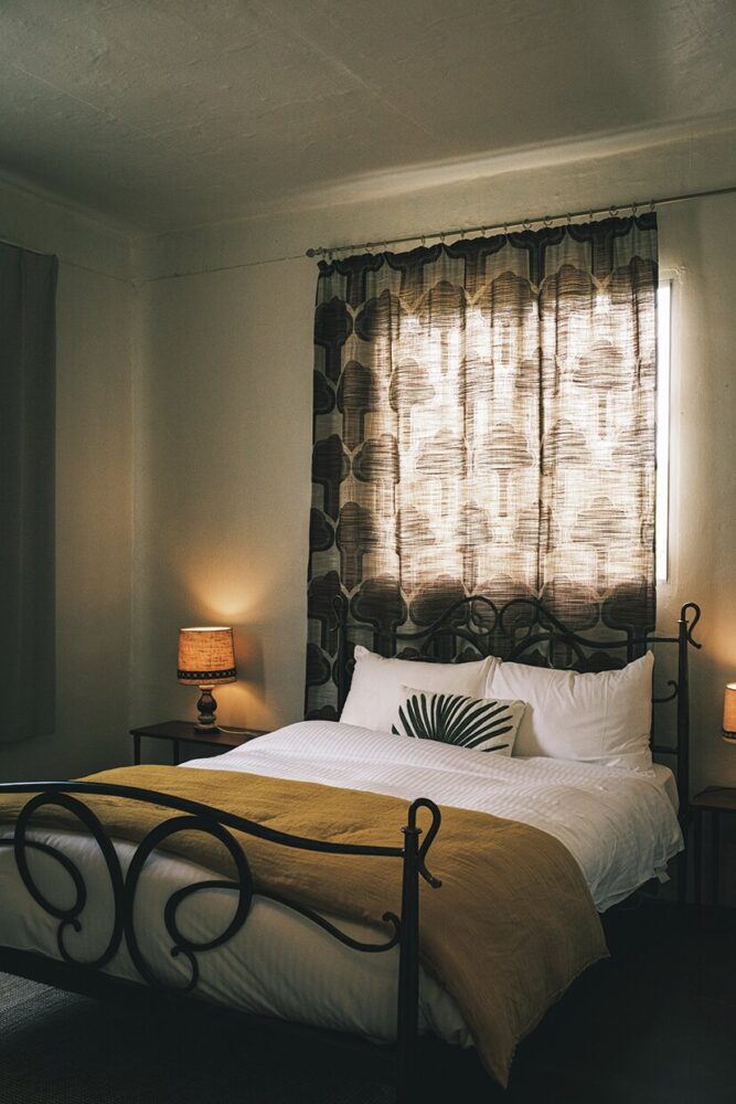 ベッドルームはツインとダブルベッドを設置した2つ。どちらもシンプルで落ち着いた空間に、ミッドセンチュリーインテリアをさりげなく設置している。長期滞在したくなる心地よさ。