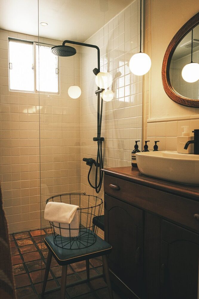 水回りは衛生面も含めしっかり改修。洗面台はヴィンテージのチェストをリメイクしたもの。