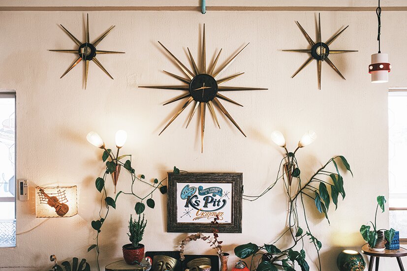 1950~’70年代、沖縄の各所に米兵とその家族のために“外人住宅”がつくられた。天井が高く、梁や柱ではなく壁で支える平屋。今ではもう使われていないこの外人住宅をリノベーションして再利用されているのだ。中には当時の照明などインテリアが残されたままになっていることも多く、それを活かすようにミッドセンチュリーモダンの空間を作り出していたり、また世代的に、アメリカのミッドセンチュリーに憧れを持っている人が自身のコレクションを使ってお店を開いたりという人も。