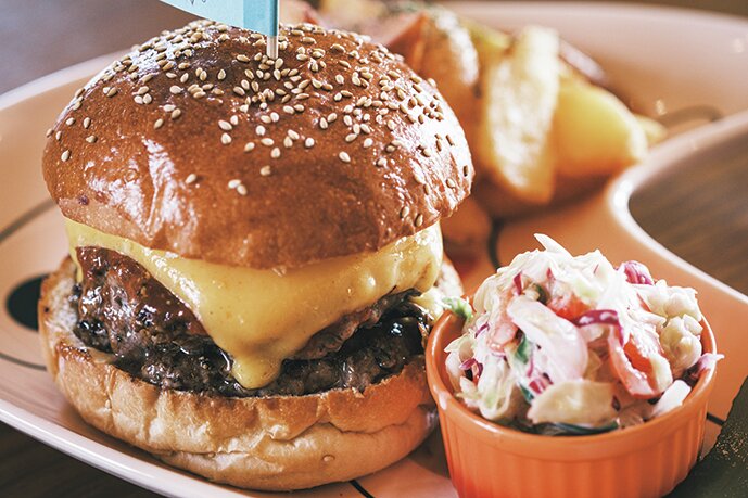 愛知に本店を持つハンバーガーの名店が、2022年沖縄に誕生。オーナーの趣味を具現化したミッドセンチュリーモダンが特徴で、米軍基地からのお客さんも多く、まるでアメリカそのもの。ここは日本かそれともアメリカか……。錯覚を楽しんで欲しい。