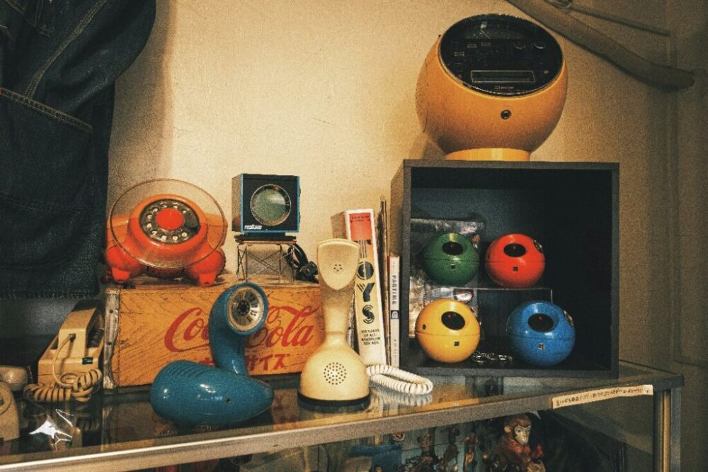 インテリア雑貨の中にはアトミックデザインの電話やラジオなどもある。これらは今でも現役で使うことができるそうだ。