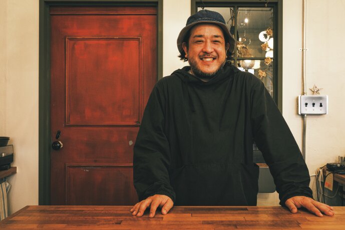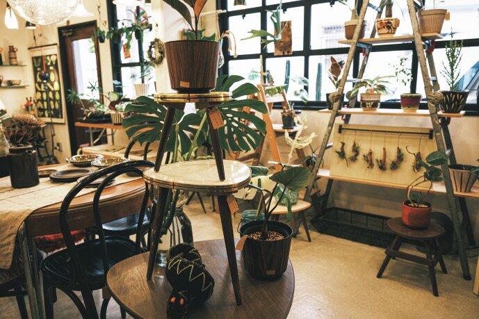 沖縄のヴィンテージ家具ショップ「STOMP」から独立した大城さん。買い付けたアイテムを修理したり、植物を育てたりと手先が器用。