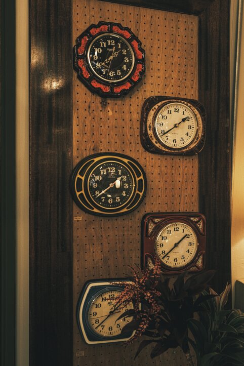 太陽をイメージしたミッドセンチュリーを代表するデザインの掛け時計。大村さんの自宅で使っていたものを持ってきたという。大小組み合わせた絶妙なレイアウト。