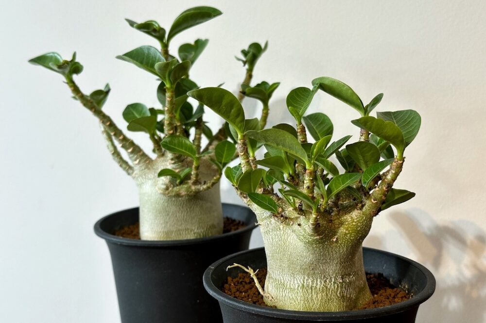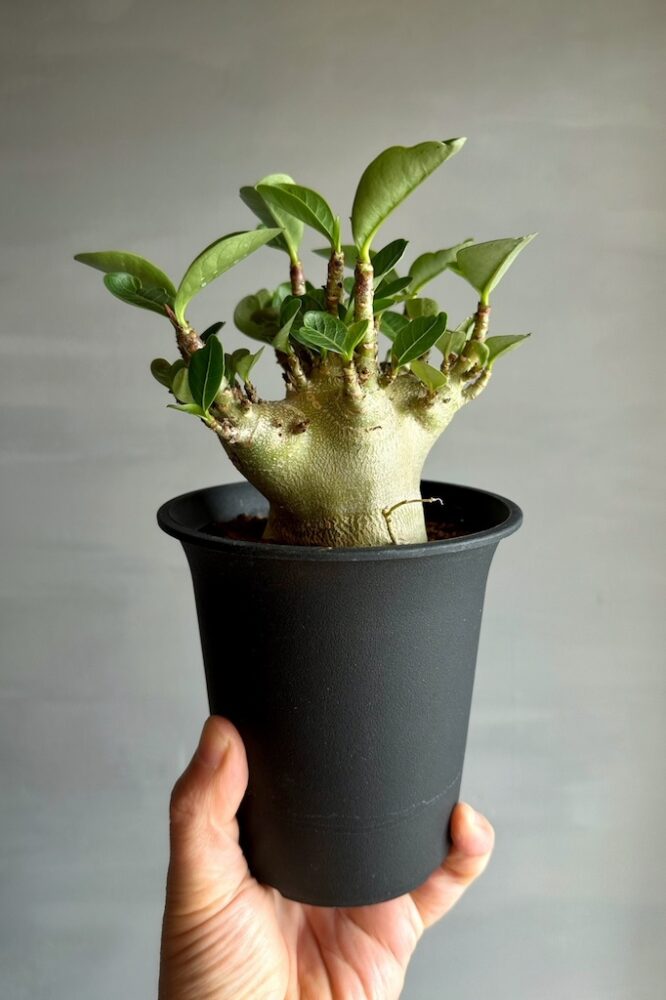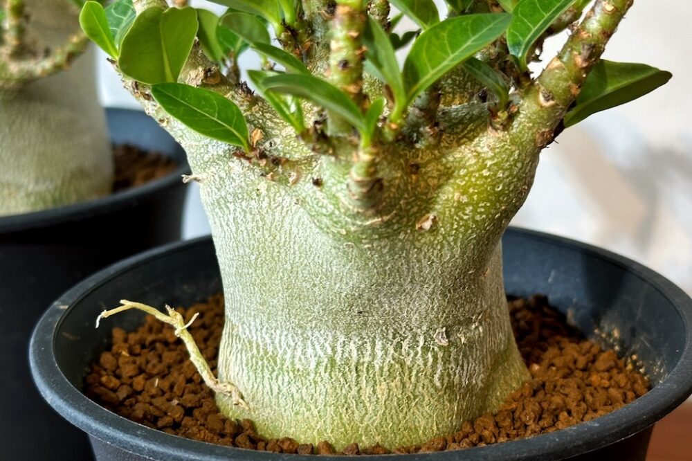 画像の個体は、アデニウム・アラビカム”ドワーフ”として流通しているタイプで小さな個体でも塊根が太く、複数の枝を伸ばす樹形が魅力的です。