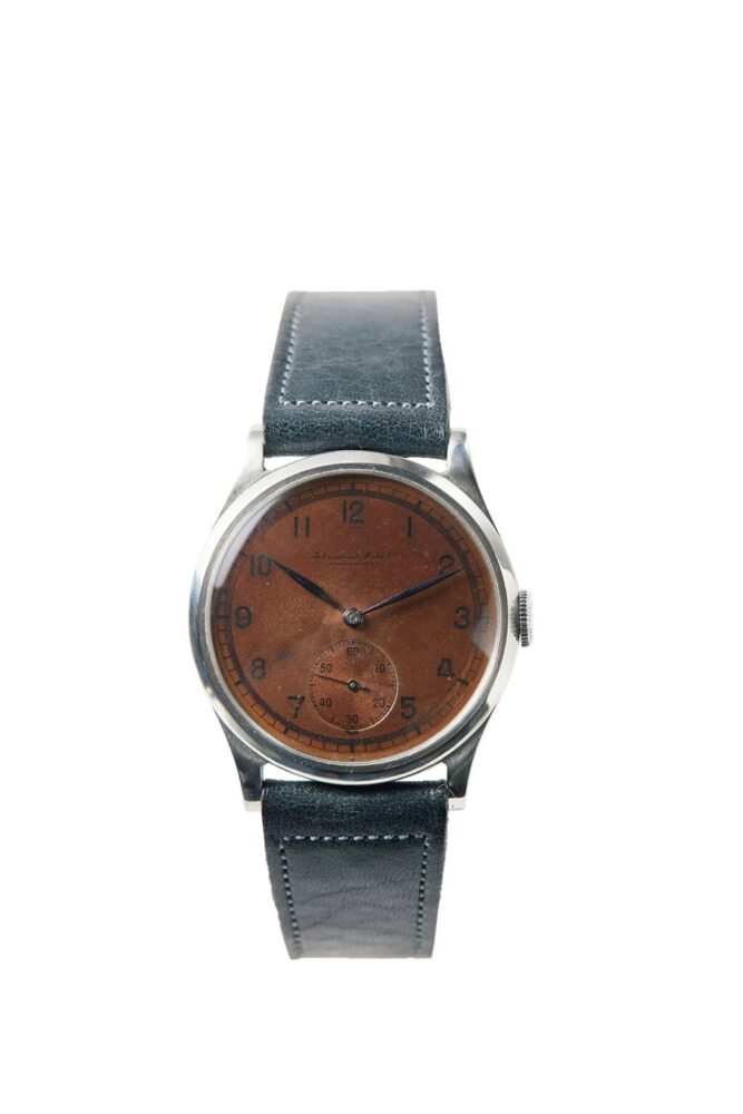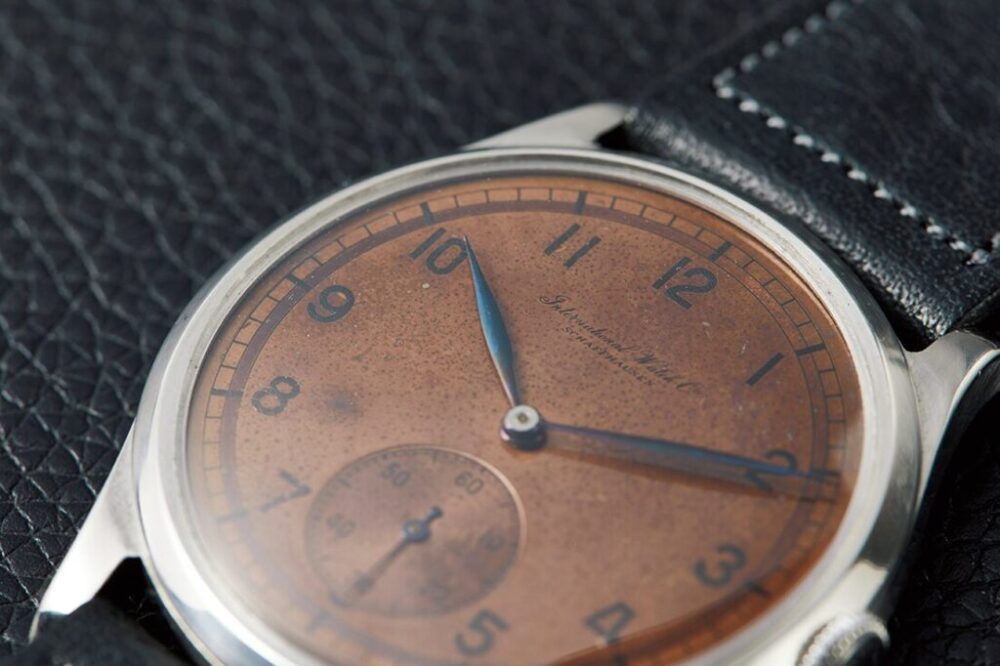 おそらくブラックだった文字盤がエイジングされてブラウンチェンジしたIWCのスモールセコンド。1930年代を象徴するブルースティールと呼ばれる青い針が特徴だ。61万6000円