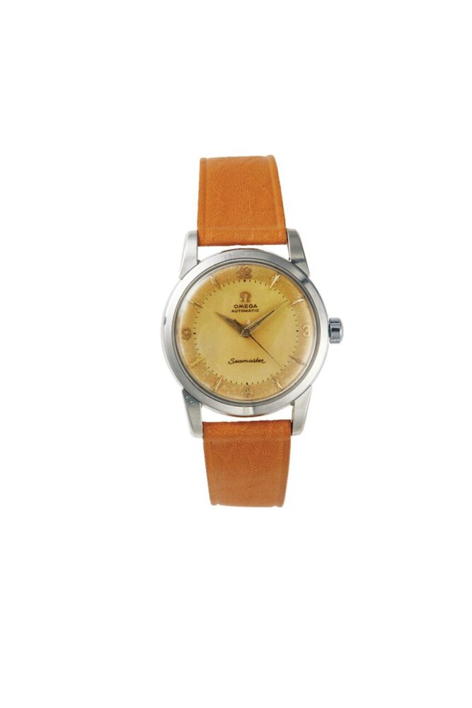 今も続くオメガの名作スポーツウォッチであるシーマスターは、1957年製。クサビのインデックスやアップライトのロゴなど、この年代特有。19万8000円