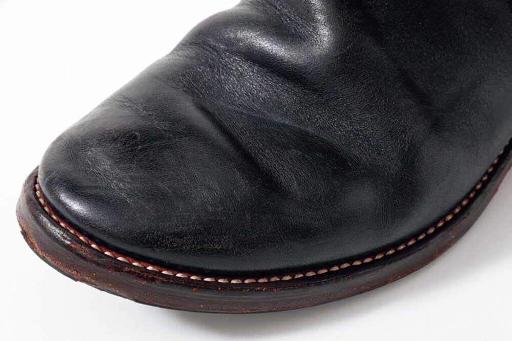 ヴィンテージをモチーフにしながらも新たに木型を用意し、先芯を無くすことですっきりとしたシルエットを構築している。使用する素材は茶芯のホースバットレザーを使用する。