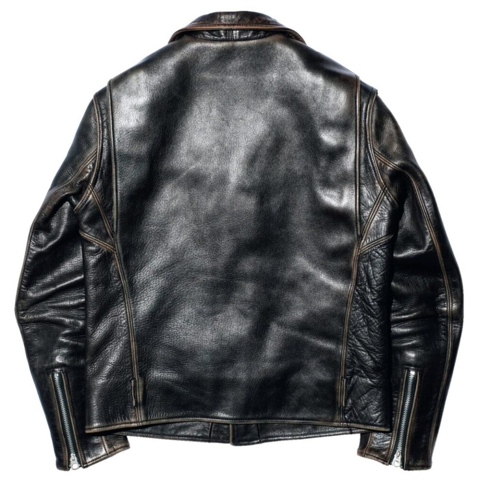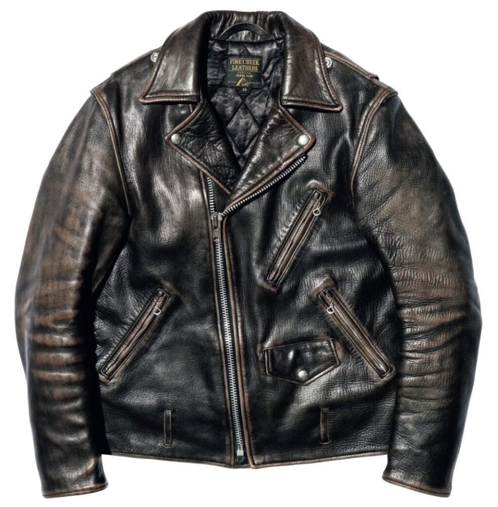 王道のダブルライダースジャケットをベースに、1950~’70年代のディテールを取り入れ、ファインクリークが思う理想のダブルライダースを作り上げたのが、このレオン。1.8㎜厚のフルベジタブルタンニン鞣しのホースハイドを採用し、まず芯通しで茶の水性染料で芯通しで染め、その後、芯まで染めずに黒で丸染めした、いわゆる“サンドウィッチ”仕様の茶芯となっている。着込むほどにうっすらとした“面”で出現する茶芯が楽しめ、その様はさながらヴィンテージのようでもある。20万6800円~