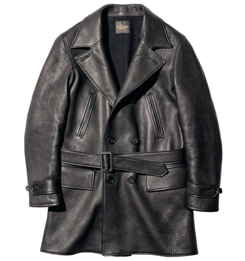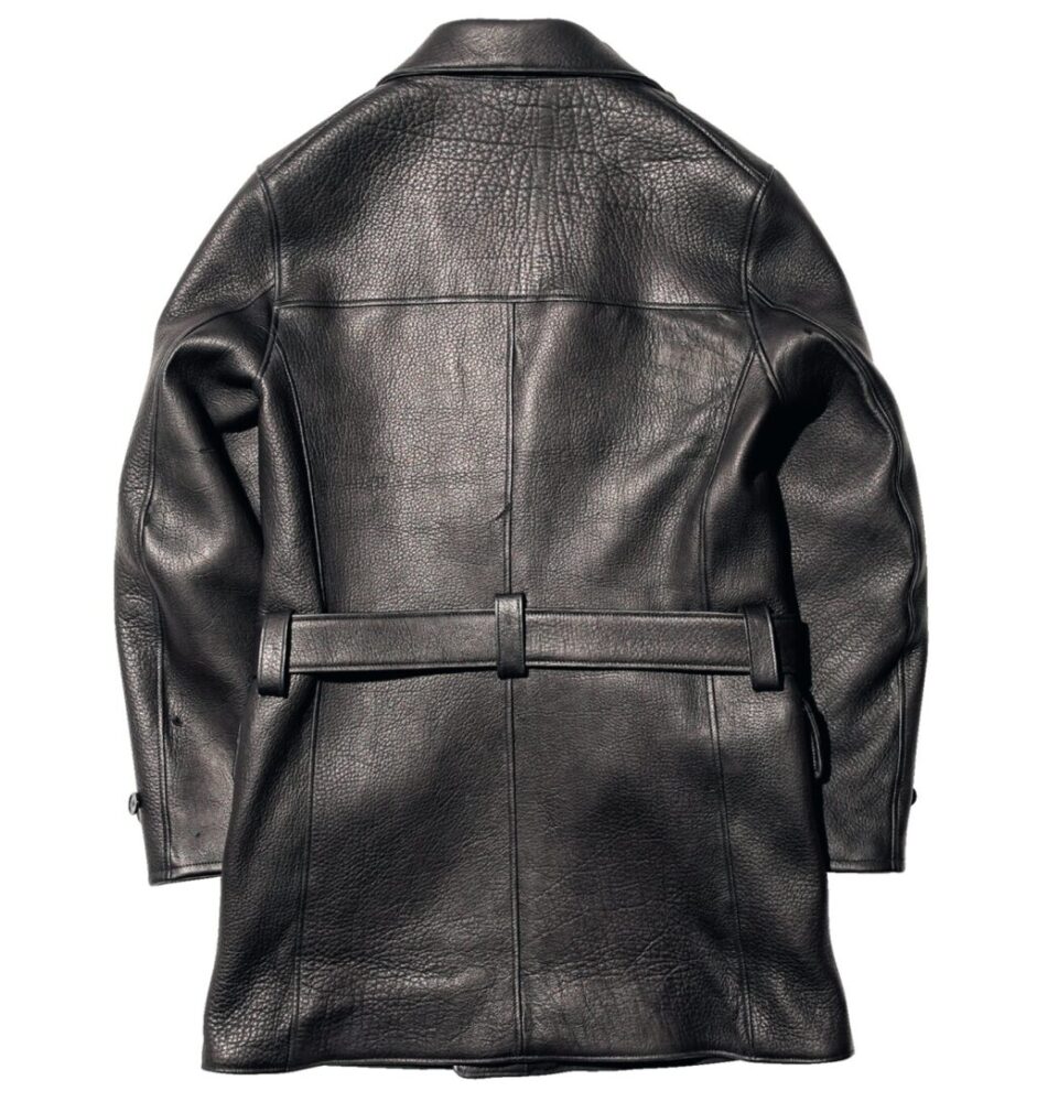 ビジネスシーンでも活躍してくれそうなファインクリーク&コーの新作モデル。デザインモチーフは1930年代に見られたアビエーターコート。オリジナルはホースハイドが使われていることが多いが、デザインはそのままに、素材をベジタブルタンニン鞣しのワピチに変更して再構築した。ワピチとはアメリカの大型のヘラジカで、5.6㎜の革を2.6㎜に割って使用している。ただ、重量を考えて襟裏や袖裏などの見えない部分を1.8㎜とすることで軽量化を図っている。31万9900円~