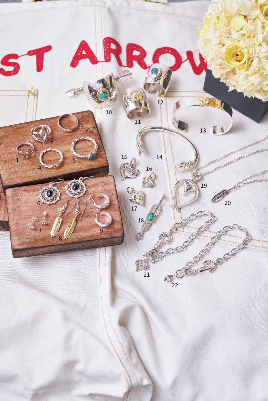 一般的にネイティブ系のシルバーアクセサリーは “ゴツくてワイルド” という男性的なイメージが強いが、繊細で上品な作風が特徴のファーストアローズ作品には女性におすすめの作品も多数。なかには、フラワーやハート、ナジャ(女性の子宮を象って “子孫繁栄” などの意味が込められる)といった女性的なモチーフ、素材にピンクシルバーを用いた作品も数多い。最愛の女性に贈るプレゼントにぜひどうぞ。
