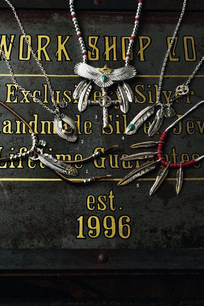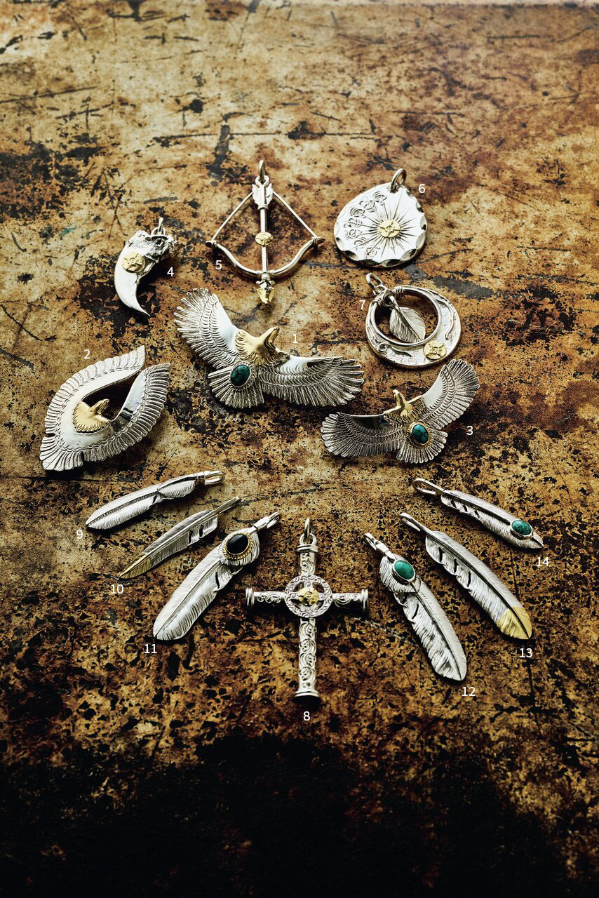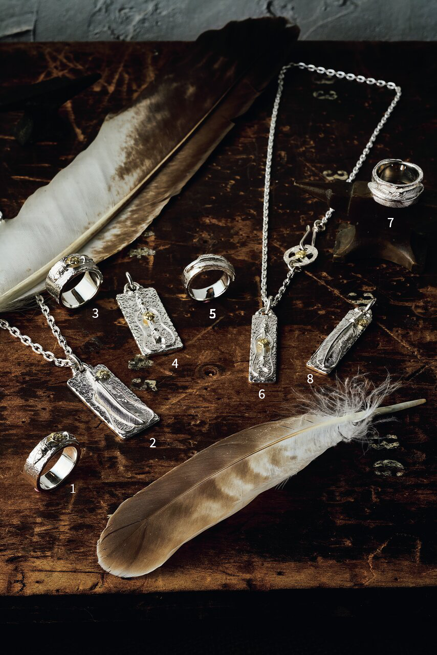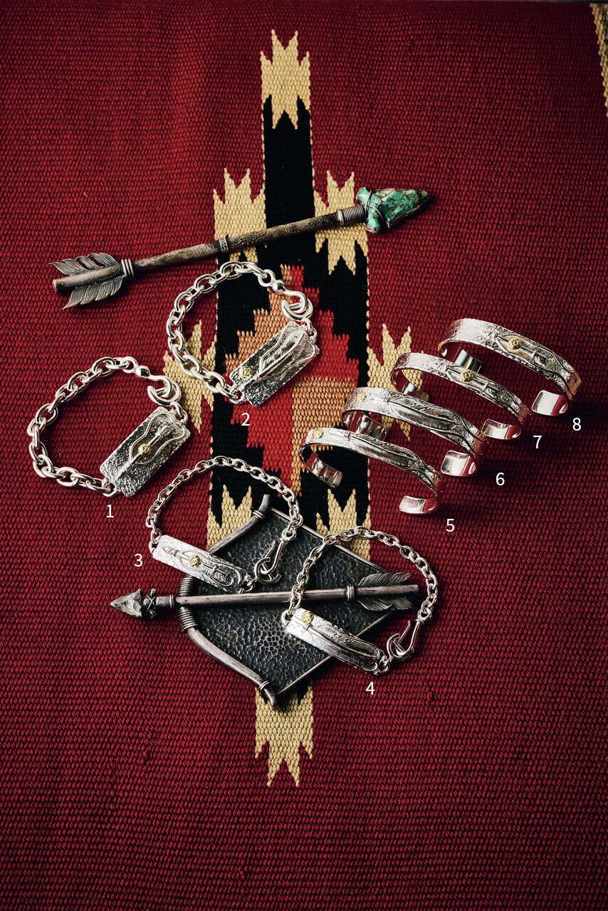 オリジナルのモチーフも多いファーストアローズだが、そのルーツはネイティブアメリカンの伝統的スタイルにある。そんなファーストアローズの魅力を知るなら、イーグル、フェザー、太陽、アラベスクといった定番モチーフ作品を手に取ってほしい。大胆ながら正確無比のスタンプワークによって、本来ワイルドな作品に気品をプラス。止まることなく磨き続ける技術が生み出す完成度の高さこそがブランドとしての誇りでもある。