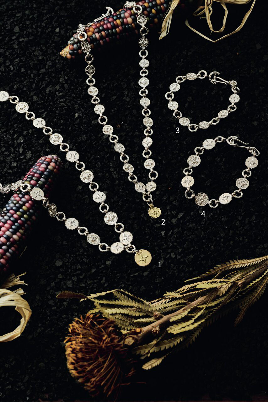 2024秋冬の新作第2弾は、全ての起源である太陽をモチーフにしたブランドのマークと、ネイティブアメリカンの間では自然や人の一生のサイクルを表し、自身の進むべき方向を示してくれるお守りとされるメディスンホイールを表と裏に刻印したチェーンとブレスレット。チェーンはお好みのペンダントヘッドと組み合わせてオリジナルの1品を作るという楽しみ方もある。