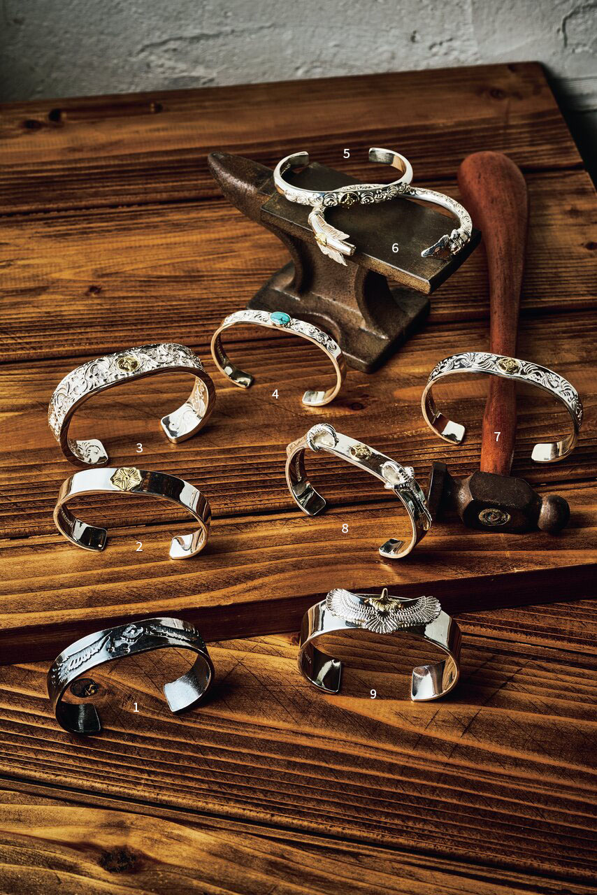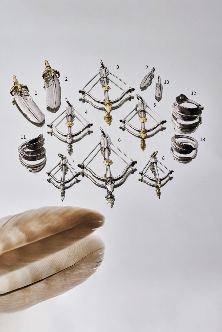 首元のペンダントヘッド、指先のリング、そして手首を彩るバングル・ブレスレットも人気のカテゴリー。全ての作品においてファーストアローズで使用するシルバーはアクセサリー加工に適する強度と輝きを併せ持つ950ブリタニアシルバー(銀95%、銅など5%)をメインに、強度を必要とする部位には925スターリングシルバー(銀92.5%)を使用することで美しさと強度を両立させている。