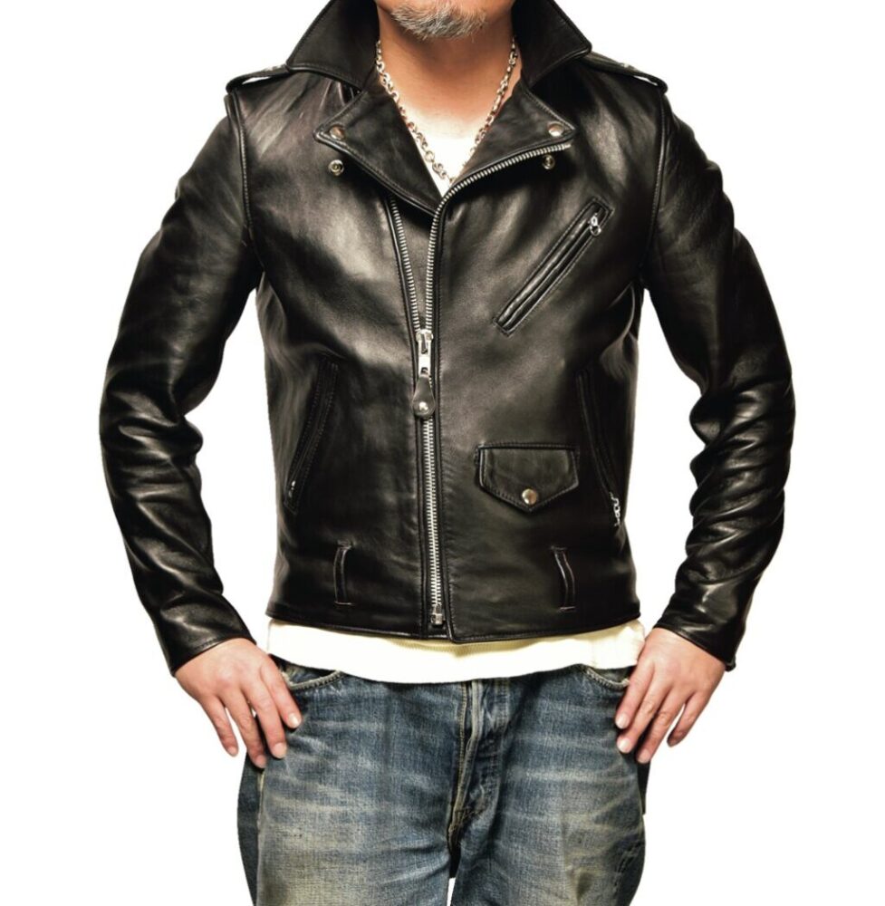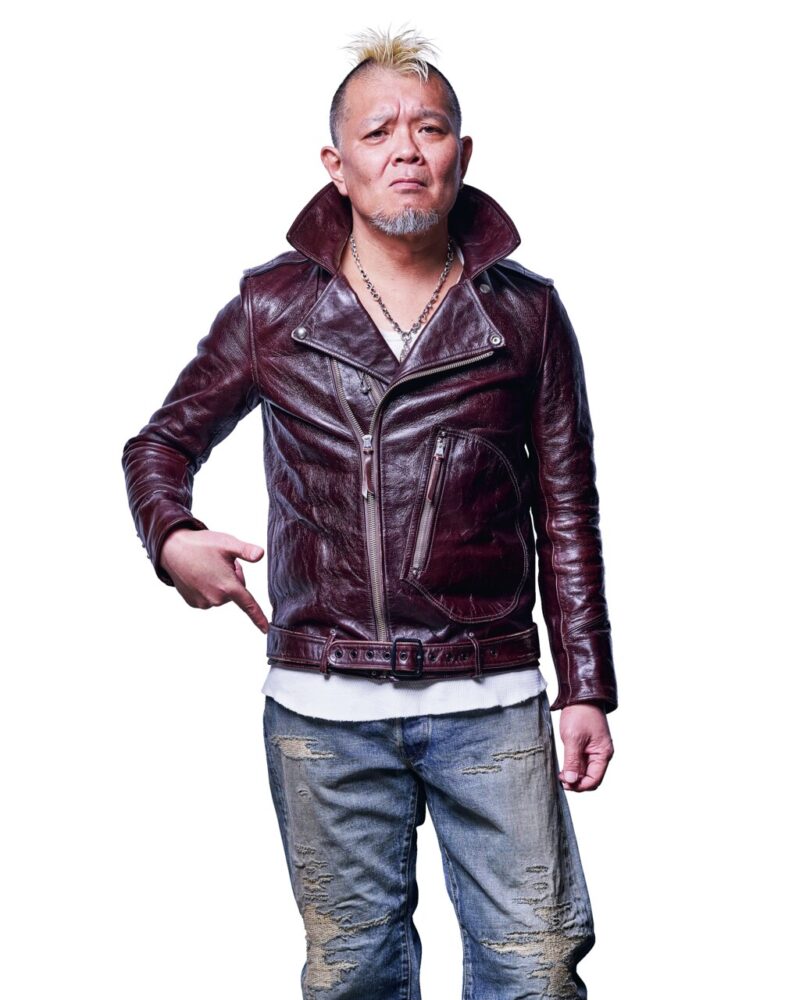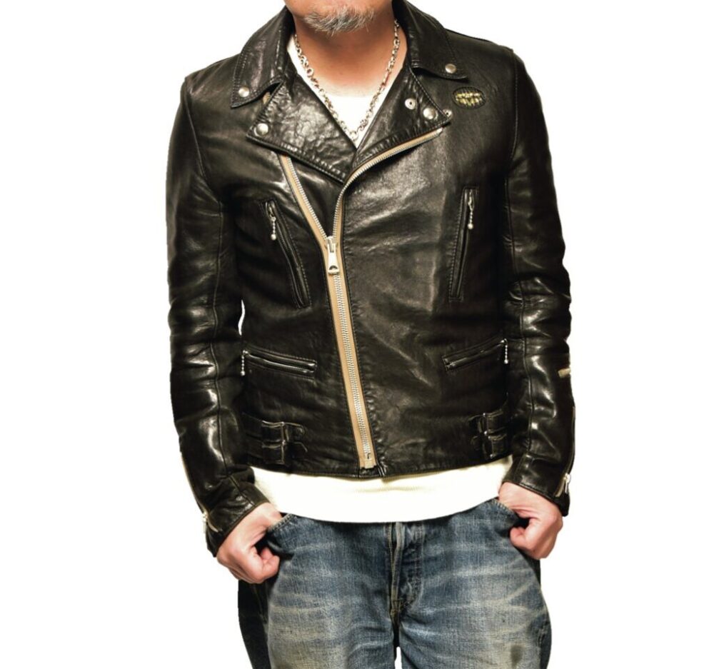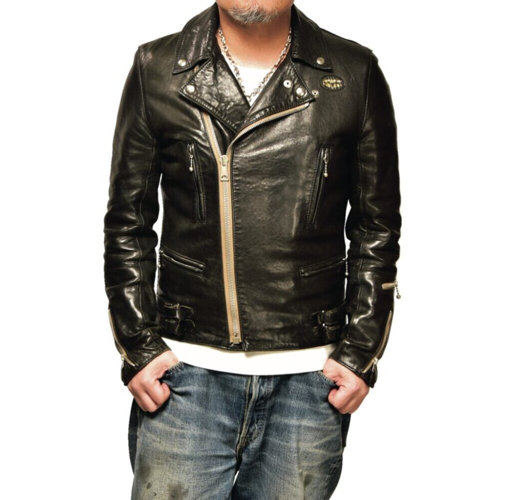 モヒカン小川の私物革ジャンとハイウェイナインを実際に合わせてみた。身長175㎝・体重72㎏のモヒ小川はリブTシャツのLサイズをチョイス。使用した革ジャンはリアルマッコイズのA-2、ショット・ワンスター、ルイスレザーズのライトニング。どう? 最高の着丈じゃね?