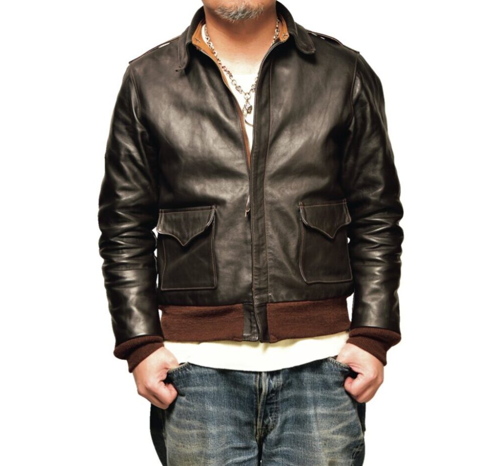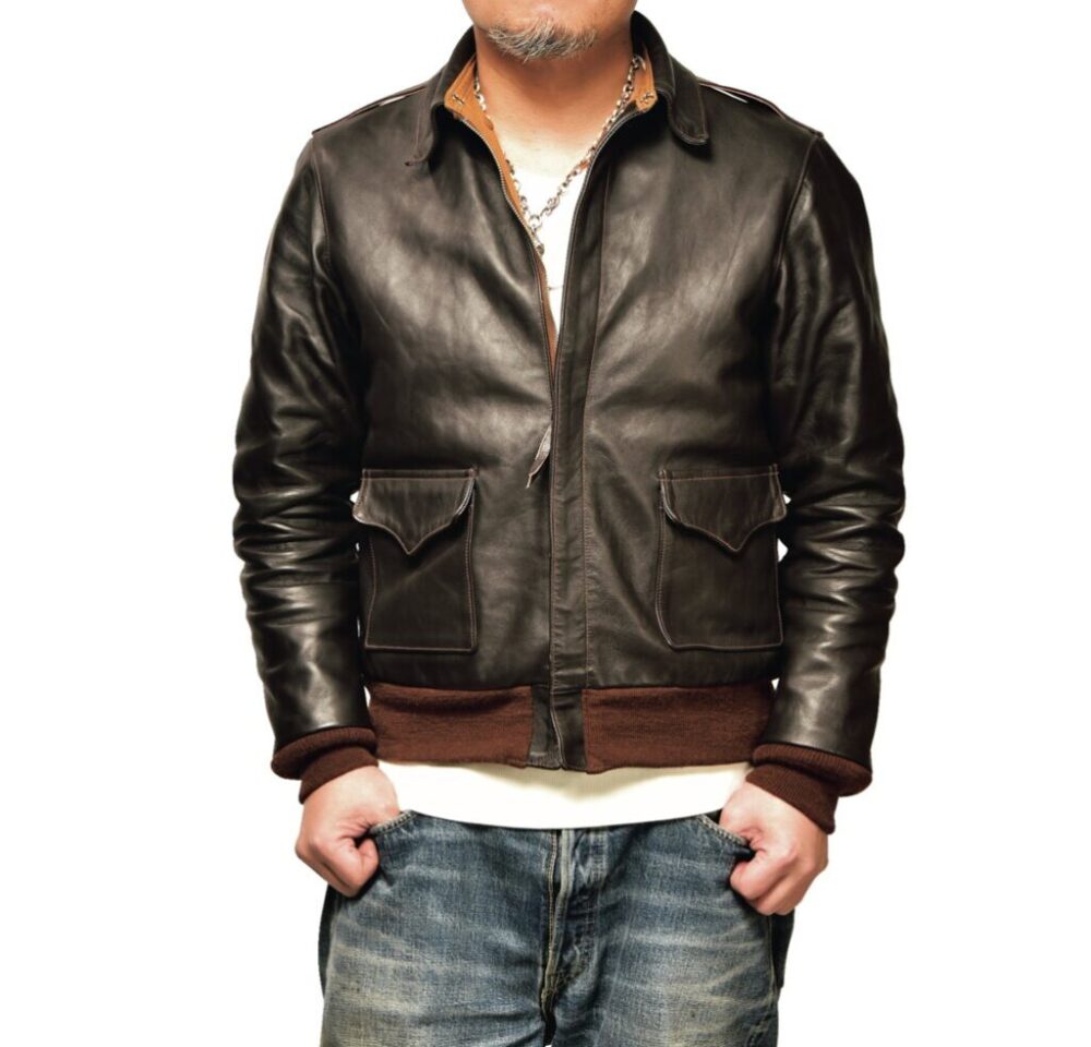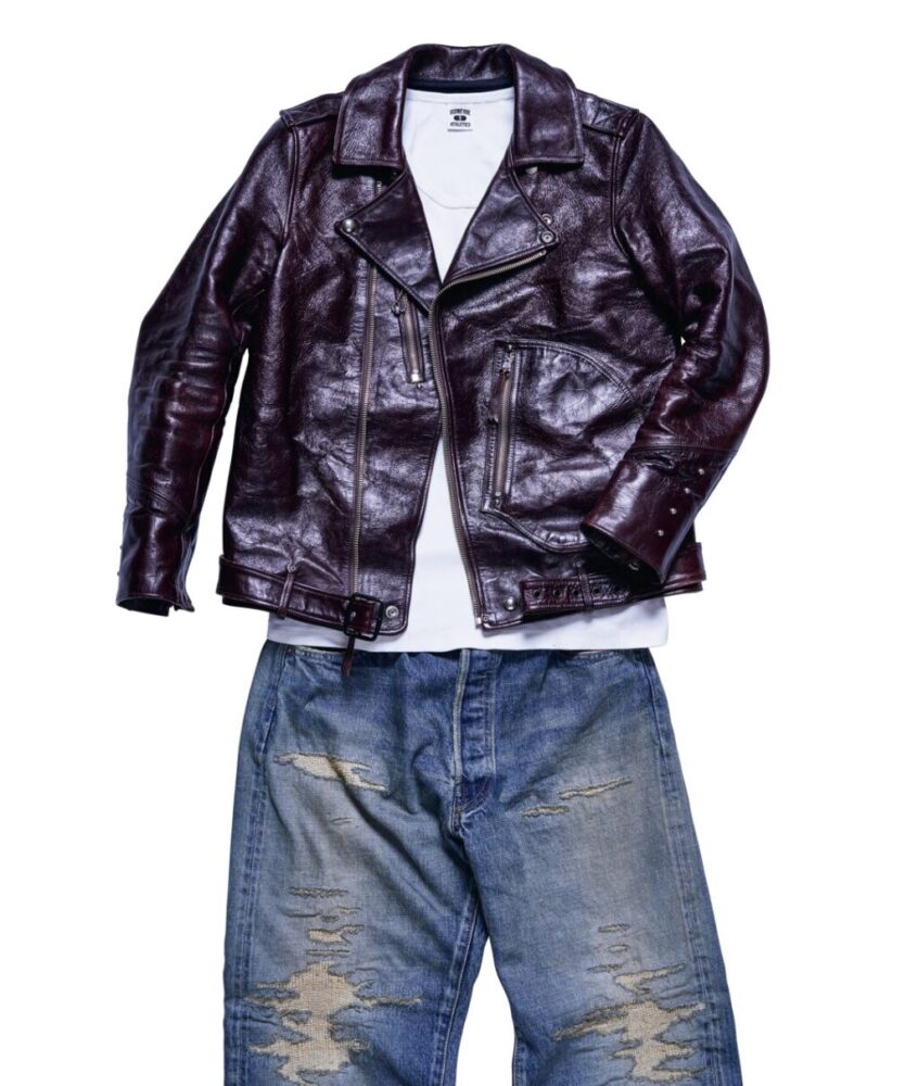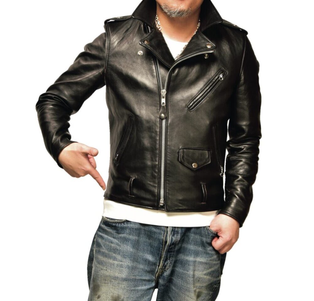 モヒカン小川の私物革ジャンとハイウェイナインを実際に合わせてみた。身長175㎝・体重72㎏のモヒ小川はリブTシャツのLサイズをチョイス。使用した革ジャンはリアルマッコイズのA-2、ショット・ワンスター、ルイスレザーズのライトニング。どう? 最高の着丈じゃね?