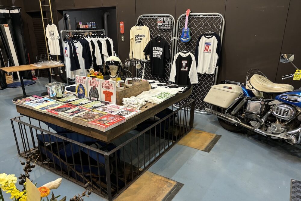 またレストランフロアの隣には、かつて整備工場だったスペースをリノベーションしてオーナーのセレクトするバイカー系アイテムも販売。ここにLightningのオリジナルグッズや、大分県で唯一FIRST ARROW’sをセレクト、その他にもVIN&AGE、BLACK FLYSなどをそろえている。