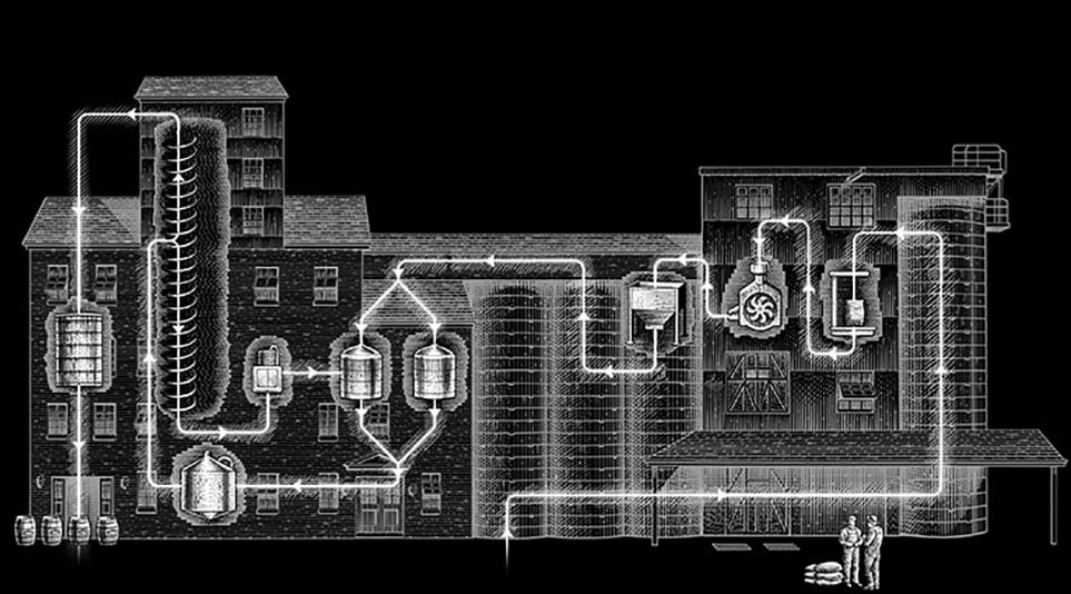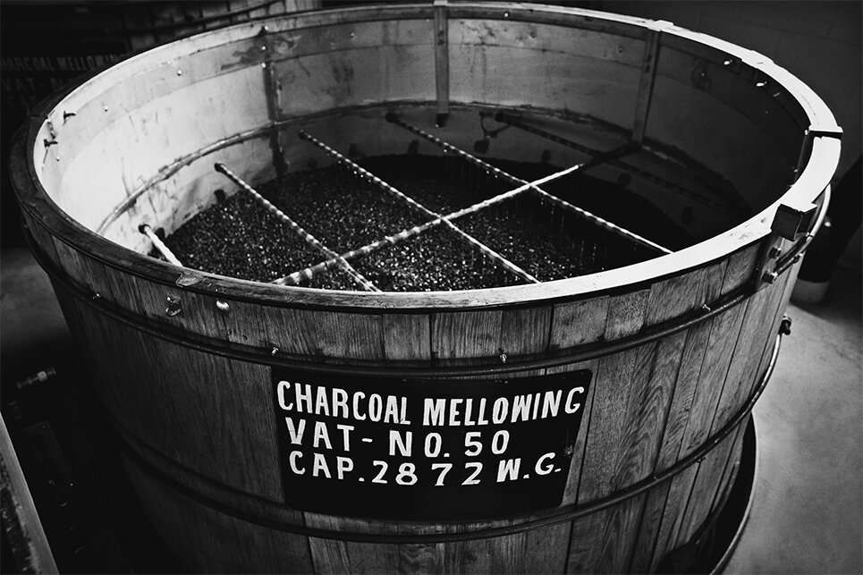 チャコール・メローイングとは蒸溜したウイスキー原酒を炭でろ過する工程のこと。蒸溜所ではサトウカエデというメープルシロップをつくる際に使われる木を炭にして高さ約3mの巨大な槽に敷き詰める。槽の上にはパイプが通っており、蒸溜したばかりの度数70%の原酒を一滴一滴上から炭に垂らしろ過する。
