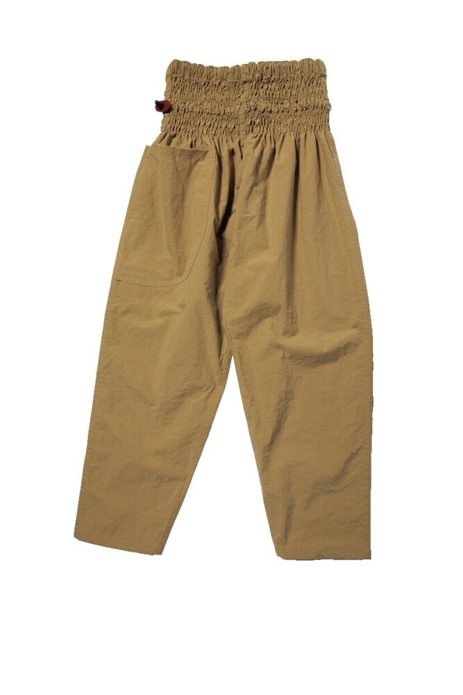 一番の特徴は幅広のウエスト。平ゴム、シャーリングゴム、コードゴムと締め付けの異なる3種類を組み合わせることでよく伸び、様々な体型の人にフィット。ワンサイズのみの展開で、身長175㎝の人は腰で、143㎝の私はハイウエストで、と穿くスタイルを選ぶことができるという仕組みだ。なんて自由なパンツ! ヘビロテ決定です。