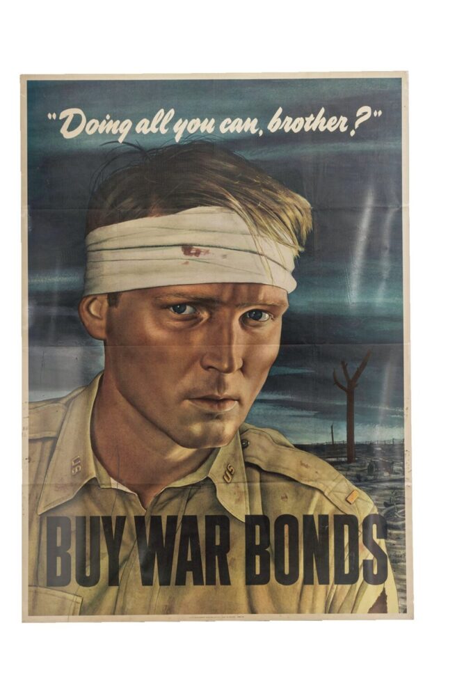 1943年に米政府印刷局から発行された戦時国債キャンペーンポスター。「BONDS」とは国債のこと。“Doing all you can, brother?(可能な限りの援助を!)”というメッセージ入り。約72.3 × 111.8㎝。3万800円