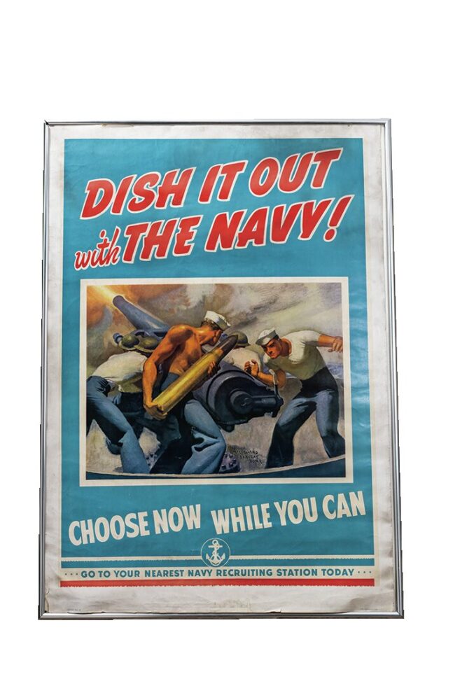 “Dish it out with the Navy!(海軍とともに全力を尽くそう!)”というメッセージとアートなタッチで海軍兵が描かれた米海軍新兵募集ポスター。1942年製。約72×111㎝。ASK