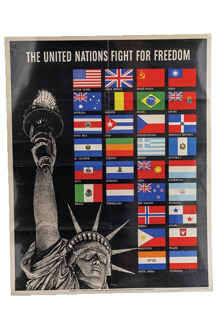 戦時情報局が1942年に発行した戦時中のキャンペーンポスター。自由の女神とともに当時のアメリカの同盟国の国旗が並ぶ。当然、日独伊はなし。約56×70.8㎝。1万9800円