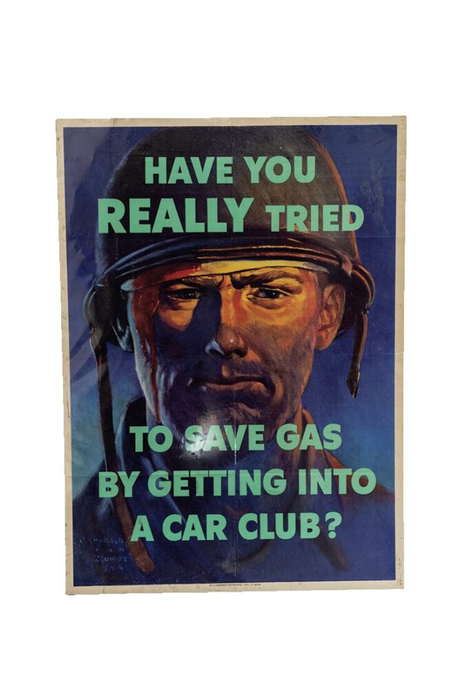 1944年発行のガソリン節約ポスター。作画はシンガー・画家としても活躍し、ボブ・ディランとも交流があったエリック・フォン・シュミットの父・ハルロド・フォン・シュミット。約50.8×71㎝。2万900円