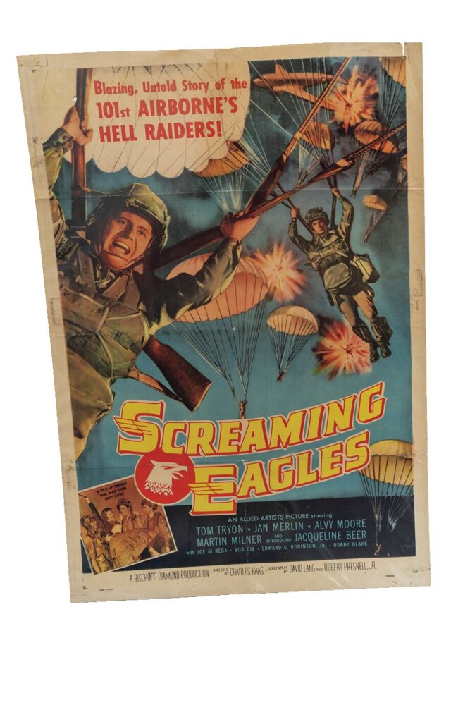 1957年に公開された 『SCREAMING EAGLES(邦題:突撃ヤンキー部隊)』のオリジナルポスター。第101空挺師団「SCREAMING EAGLES」のノルマンディ上陸作戦時の活躍を描いた映画。約69×104㎝。3万4760円
