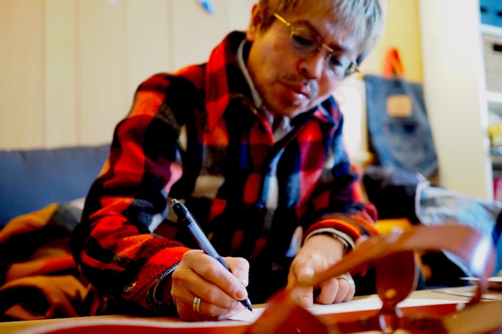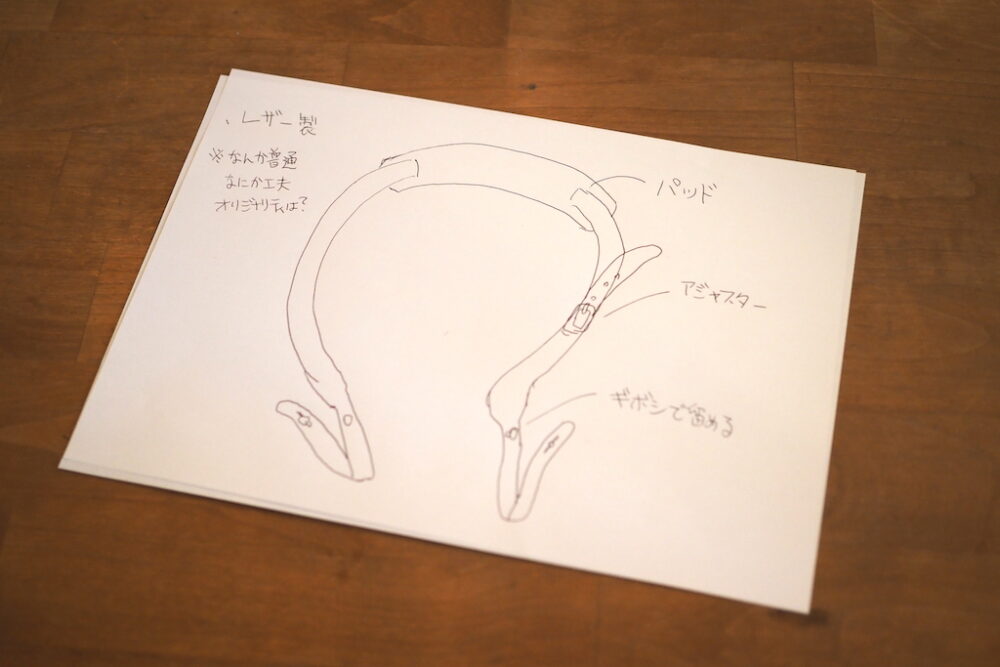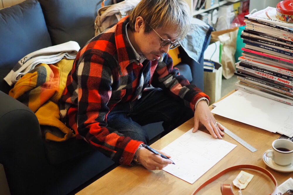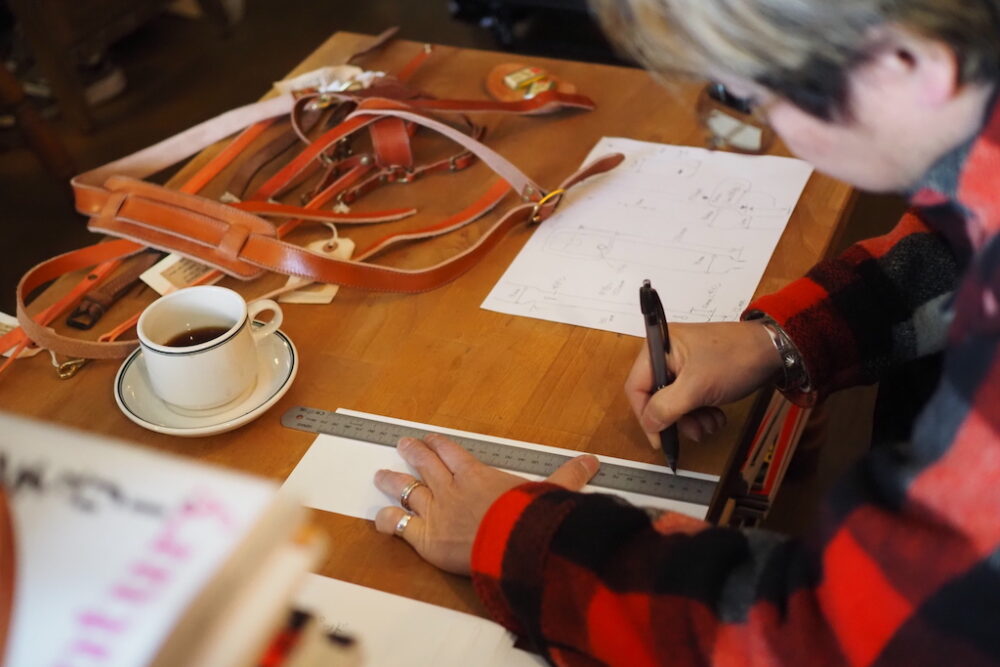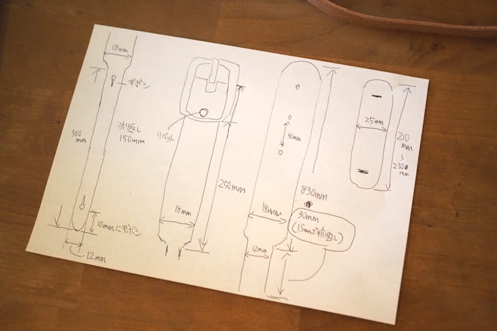 スターディ・レザーアカデミーでは用意されたアイテムのなかからひとつを作る初級コースをひととおり体験すると、素材となるレザーを1枚購入して自由課題コースが受講できる。筆者は以前初級コースのデニムエプロンを制作したので、次のステップとして自由課題コースにステップアップできるってわけだ。そこでカメラストラップを作りたいと校長である水野さんに聞くと「まずは作りたいストラップをイメージして絵を描き、それをベースに設計図に落とし込み、そこからパターンを作りましょう」ということに。