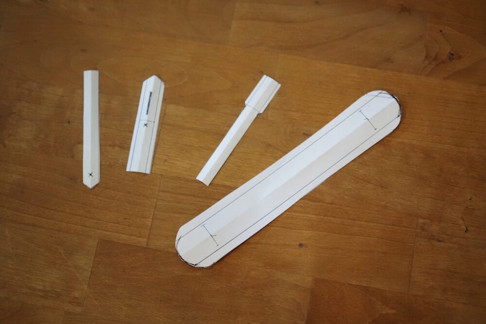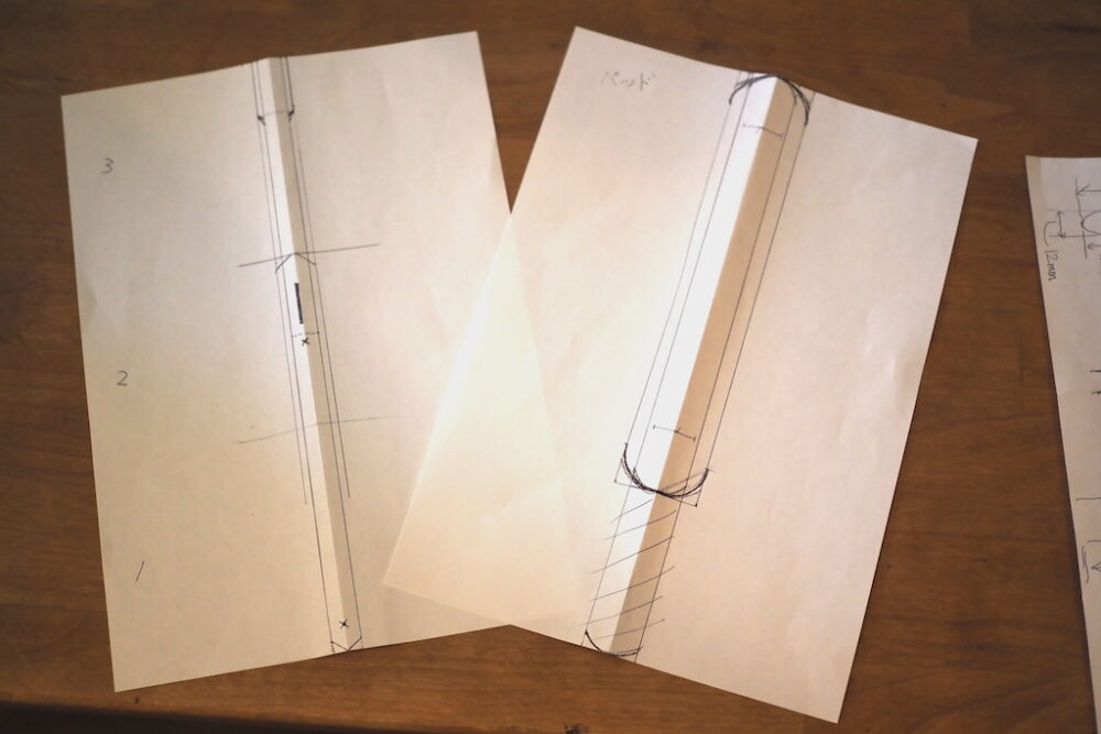 実寸を落とし込んだ設計図ができたら、それを元に実際のパーツを作るためのパターンを製作する。今回の設計図から必要なパターンは、カメラに取り付けるためのストラップの先端部、ストラップ部から本体へと繫がるレザーの幅が広がる部分、金属製バックルを取り付ける部分、パッドの4つ。最初のイメージイラストから実際のパターンになることで、ずいぶんと現実味が出てきた。これで下準備が完了。いよいよ次回は実際の制作に入るぞ!