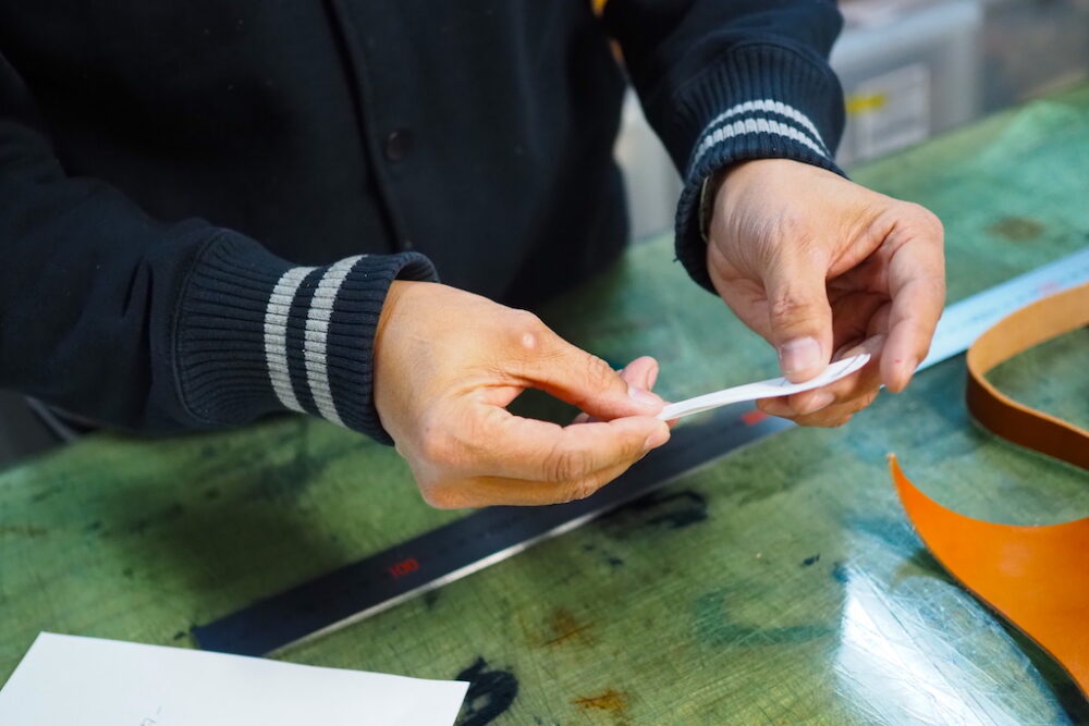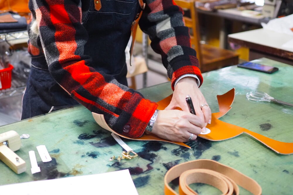 なるべく1枚のレザーから多くのパーツが取れるように考えるというのも重要な作業。なるほどなと勉強になる。貴重な天然素材を無駄にしないという教えであった。