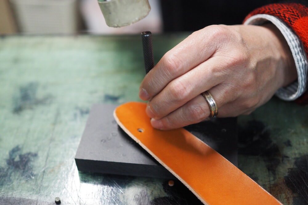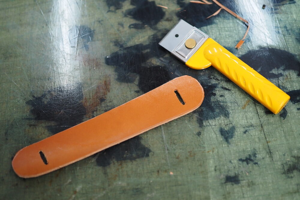 パッドになる2枚のレザーパーツを裁断。ひとつにストラップを通すために穴を空けたら両パーツを接着する。ここにはレザー用の接着剤を使用する。