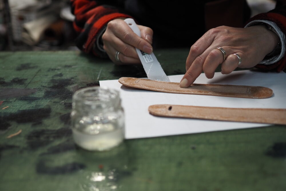 接着剤が乾いてパーツが接着されたらパッドの総仕上げ。ここで先生のチェックを受けると、上下のパーツの大きさがにズレているとの指摘が。素人だからこれくらいの誤差が出るのは想定内だったらしく、先生が左右の微調整を革包丁でキレイに仕上げてくれた。